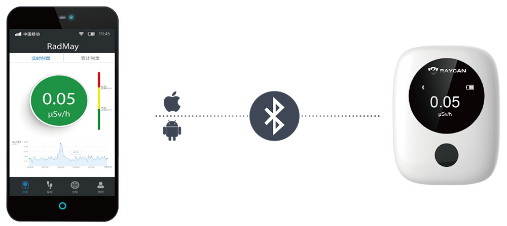 RadMay APP 可實時無線同步顯示測量數(shù)據(jù),支持用戶自定義錄制輻射軌跡,變輻射被動記錄為主動管理。RadMay為低劑量輻射健康研究提供基礎(chǔ)數(shù)據(jù),是RAYCAN基于云服務(wù)平臺的智能輻射管理的重要組成。